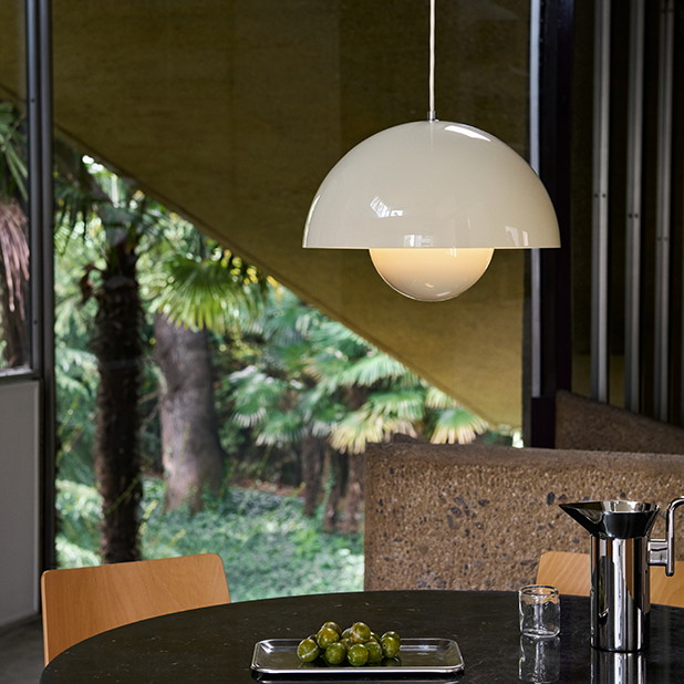 Här ser man tydligt cirklarna och halvcirklarna som Verner Panton ofta lekte med i sin formgivning. Flowerpots form gör att man inte kan bländas av ljuskällan – en myslampa som ger ett behagligt sken. Glada färger i flowerpots alla varianter gör att denna lampa är lätt att kombinera med andra element som inredningsdetalj i hemmet. Lampan ingår i en serie med bordslampa och taklampa i olika utförande och storlekar. Textilkabel i matchande kulör, längd 300 cm ingår.