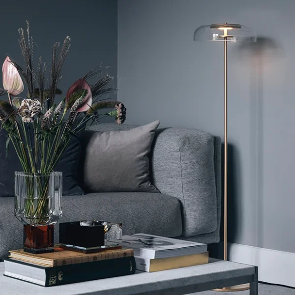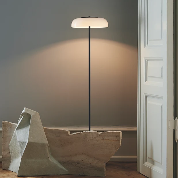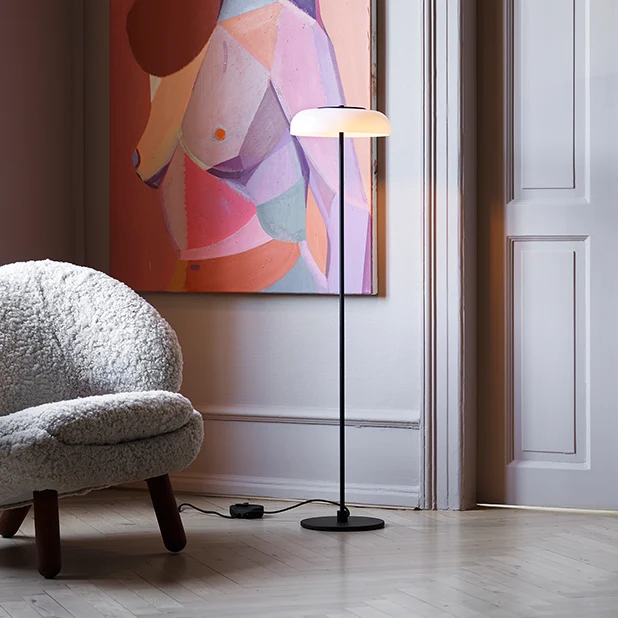 Blossi Floor är en stilren, dimbar, golvlampa med en svart metallstomme och en skärm i opalglas. Den specialutvecklade LED-skivan reflekterar ljuset i det munblåsta glaset och sprider ett mjukt, indirekt sken. Kollektionen kommer nu med en utbytbar LED-enhet som ger flimmerfritt ljus och uppfyller EU:s senaste regler för energieffektiv belysning. Med sin enkla design, estetik och funktionalitet passar Blossi Floor in i alla hemmets rum.