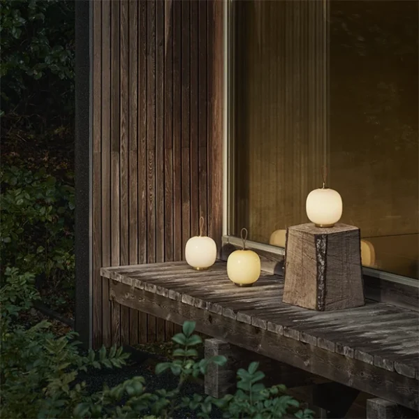 VL 45 portable bordslampa är en nytolkning av den populära VL 45 Radiohus-pendeln som ursprungligen designades av Vilhelm Lauritzen för Radiohuset i Köpenhamn. Den munblåsta glasskärmen möter detaljer i mässing som tillför en diskret touch av lyx till designen. Lampan finns i tre olika färger som alla avger ett mjukt, behagligt ljus. Mörbrun rem i äkta läder.