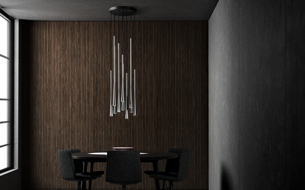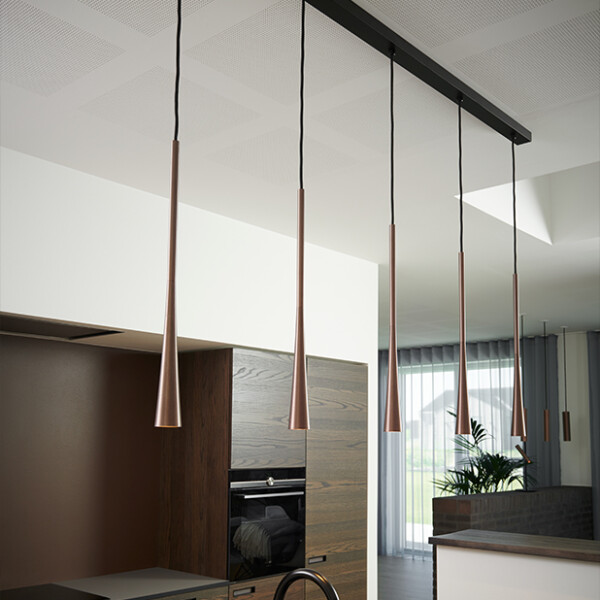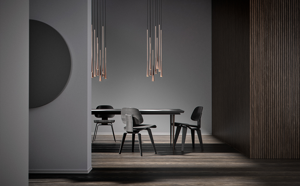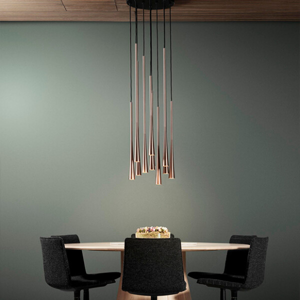 DROP är en tunn och elegant takpendel med ett namn som härstammar från formen av fallande droppar. Gruppera en klunga DROP-pendler för att skapa en slående ljuskrona för en estetisk inredning.