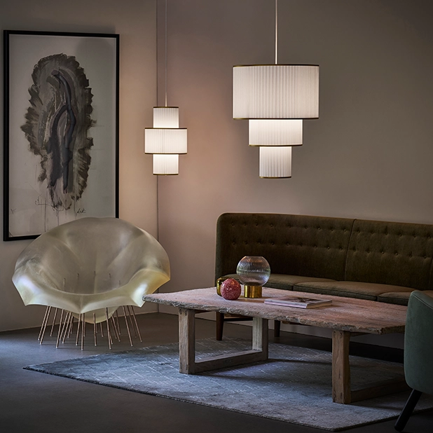 Plivello är en pendel som förenar modern elegans med en känsla av svunna tider. Formgiven av Christian Troels är designen inspirerad av klassiska flerskiktade ljuskronor från tidigare århundraden. Plivello har en design som gör den lika vacker underifrån som från sidan. Passar i många olika miljöer: i en rymlig entré med högt i tak, ovanför matbordet eller som ett iögonfallande statement i ett hörn.
