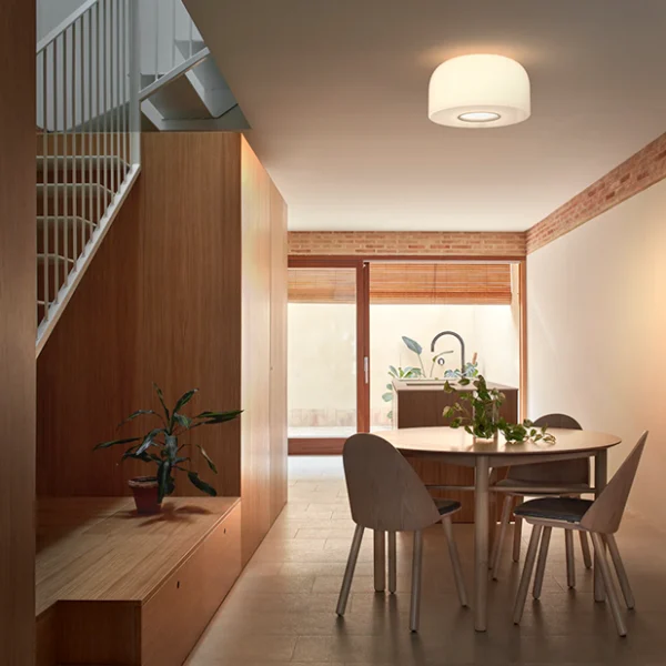 Bellhop C2 taklampa ger både stämningsljus och direkt belysning. Ljuset sprids mjukt i rummet men riktas också neråt utan att blända. Den nedre öppningen, omgiven av en färgad aluminiumring, hjälper till att styra ljuset och gör det enkelt att byta ljuskälla. Perfekt för att lysa upp ett bord med ett behagligt och fokuserat sken.