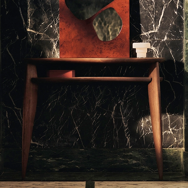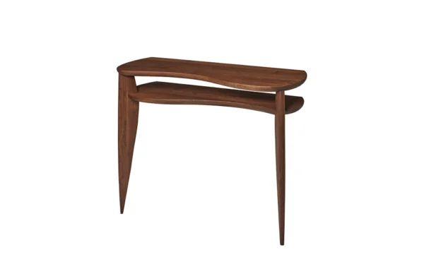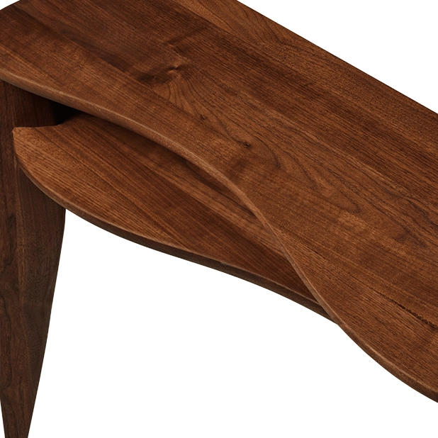 Feve konsolbord är tillverkad av massiv FSC™-certifierad europeisk valnöt. Som en naturlig förlängning av Feve-serien är den väggmonterade möbeln utrustad med två mjukt rundade hyllplan som förenar funktion och elegans. Perfekt för hall eller entré där den tillför värme, lätthet och en diskret karaktär till mindre utrymmen.