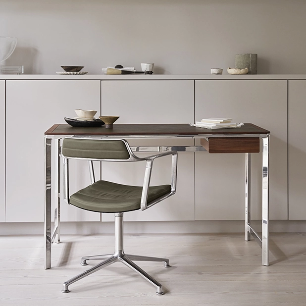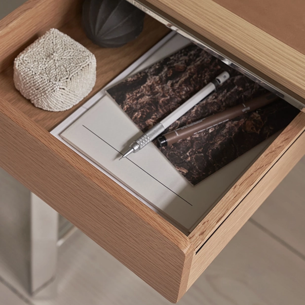 Skrivbordslådan är designad för att kunna monteras på både höger och vänster sida och tillför en praktisk men elegant förvaringslösning till Studio-skrivbordet. Även med två lådor, en på vardera sida, finns gott om plats för en snurrstol mellan dem. Tillverkad i massiv valnöt eller ljus ek. Enkel att montera och byggd för att hålla – den ger både karaktär och funktion till din arbetsplats.