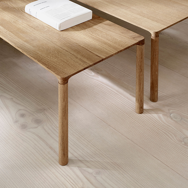Den subtila detaljeringen av bordsskivan skapar intrycket av en enda linje som flyter mellan fyra känsliga ben. Borden levereras i två höjder och kan kombineras som satsbord i olika kombinationer.