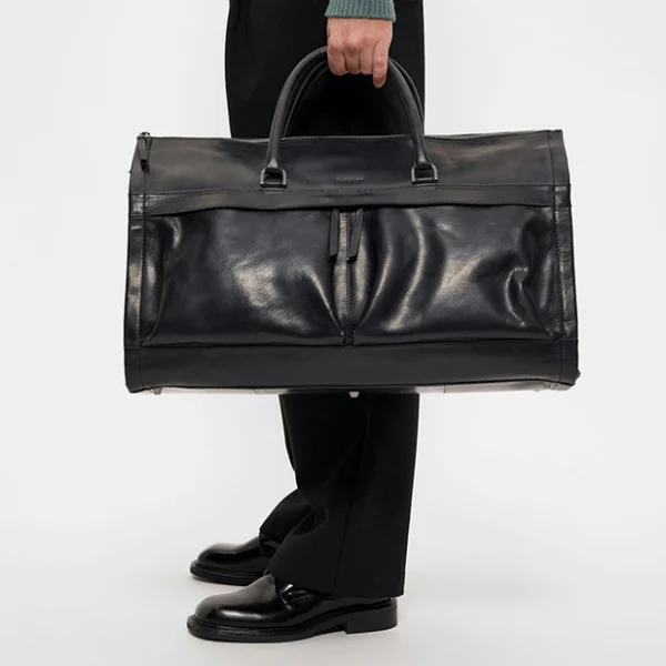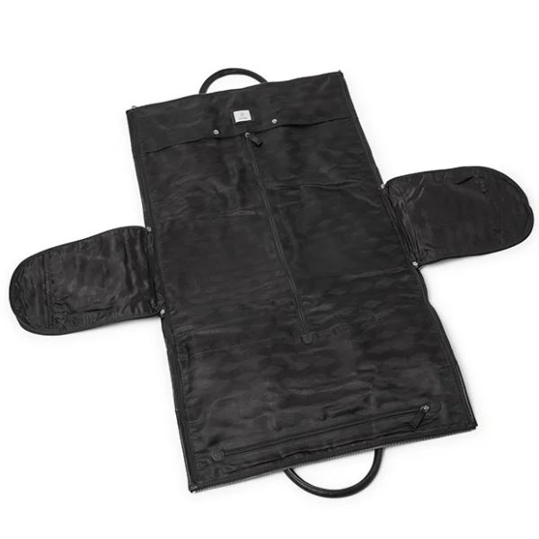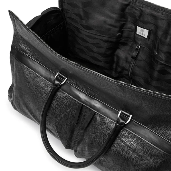 Längs med hela väskan löper en dragkedja som gör att alla väskans stycken kan öppnas upp, i bottenstycket finns ett fack där du kan fästa en galge med din skjorta och kavaj, i sidostyckena finns fickor för dina skor. Förslut väskans sidostycken och du kan sedan packa resterande likt en vanlig weekendbag. På utsidan finns även två stora fickor som båda försluts med dragkedja, där du får plats med det du behöver hålla lättillgängligt. Botten av väskan är försedd med fem nitar som skyddar ytan undertill. Det tillkommer även en juster- och avtagbar axelrem i textil med läderdetaljer. Remmen har en längd om max. 127 cm och min. 75 cm. Lädret i den här produkten är av högsta kvalitet och har behandlats i garveri certifierat av Leather Working Group.