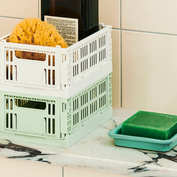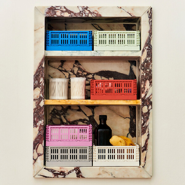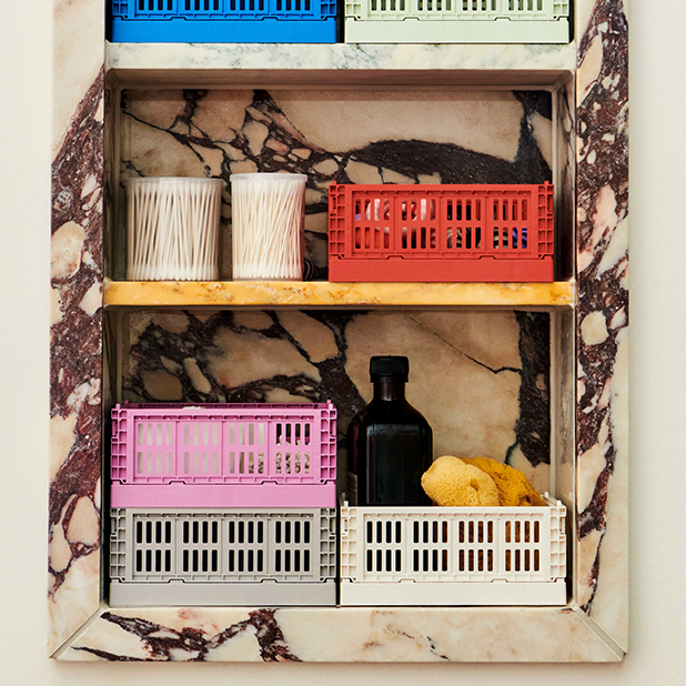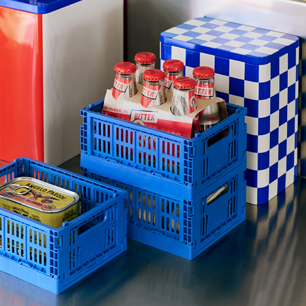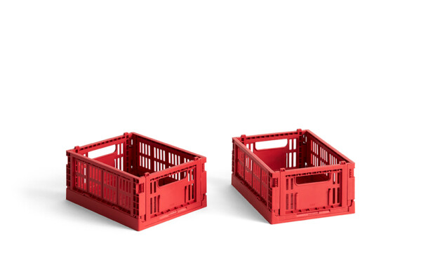 Color Crate från HAY är en serie färgglada, multifunktionella förvaringslådor med en distinkt, perforerad design. Tillverkade av 100 % återvunnet plastavfall i en mängd olika färger och storlekar, kan lådorna staplas ovanpå varandra, både i samma storlek och tillsammans med övriga storlekar. De multifunktionella lådorna är lämpliga för att förvara och organisera ett brett utbud av föremål på hyllor, bord eller inuti skåp.