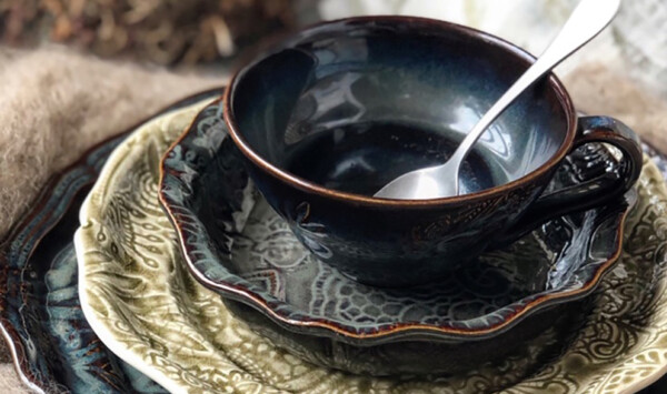 Namnet Arabesque kommer från franskan och betyder arabiska. Det är också ett speciellt konstnärligt uttryck med slingmönster av växter, blad och rankor. Alla delar tillverkas i vit stengodslera som bränns på mycket hög temperatur så att den blir hållbar och vattentät. De vackra glasyrerna är omsorgsfullt utvalda för att få maten att se aptitlig ut. Hantverket i kombination med att både leran och glasyren har ett eget liv, gör att varje enskilt gods får ett unikt utseende. Ingen del är den andra exakt lik, men släktskapet är tydligt.