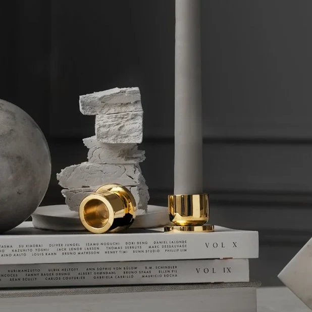 Ljusstake Bijou i polerad mässing, designad 2023 av Claesson Koivisto Rune. Minimalistisk och skulptural – liten som ett smycke men med stor närvaro.