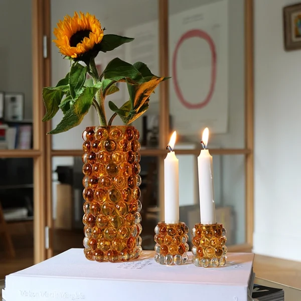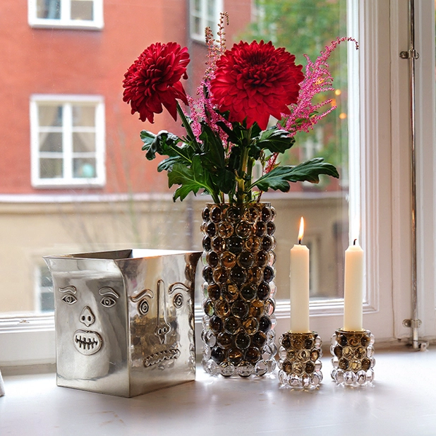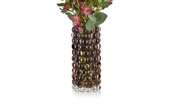 Handblåst i Böhmen, en region känd för sitt skickliga glashantverk. Bubblorna formas i en gjutjärnsform och ger Boule sitt unika optiska mönster samt en gedigen, tung känsla. Lika vacker med som utan blommor i.