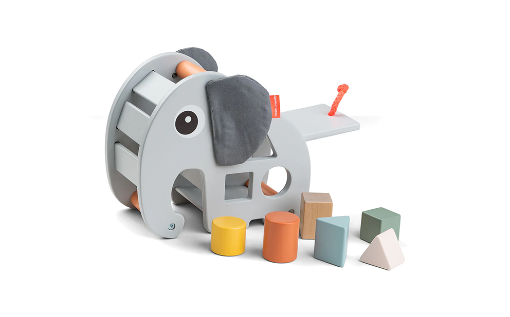 Denna leksak tränar finmotoriken samtidigt som den låter ditt barn lära sig om olika former. När de rör elefantens öron hörs ett knastrande ljud, och det finns även ett rassel i två klossar. Genom att dra i svansen öppnas locket och klossarna faller ut. Den är också utrustad med ett bärhandtag för enkel transport.