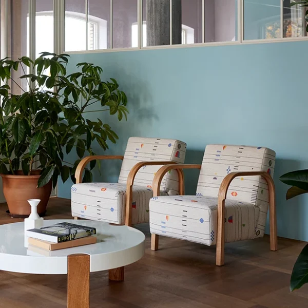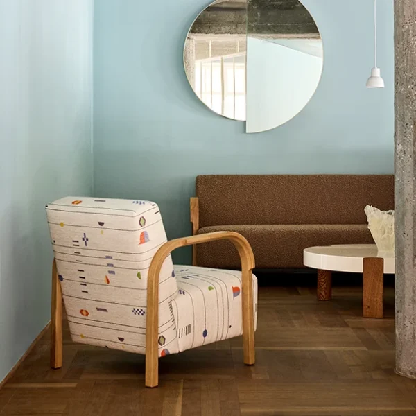 ARCH lounge chair från Mazo hyllar Magnus Læssøe Stephensen med sina skulpturala ekarmstöd och välvda ben. Finns i flera exklusiva klädslar.