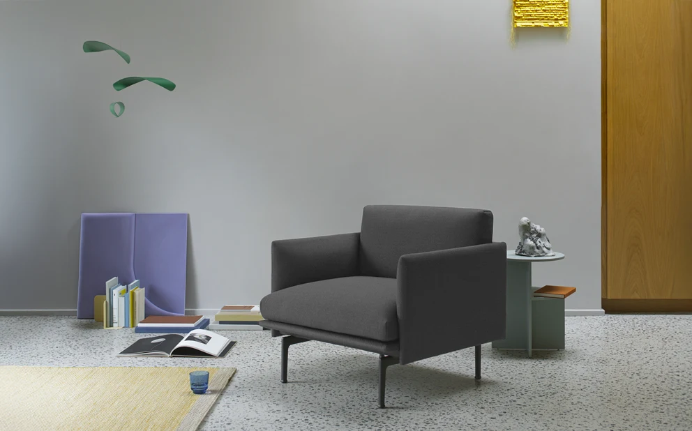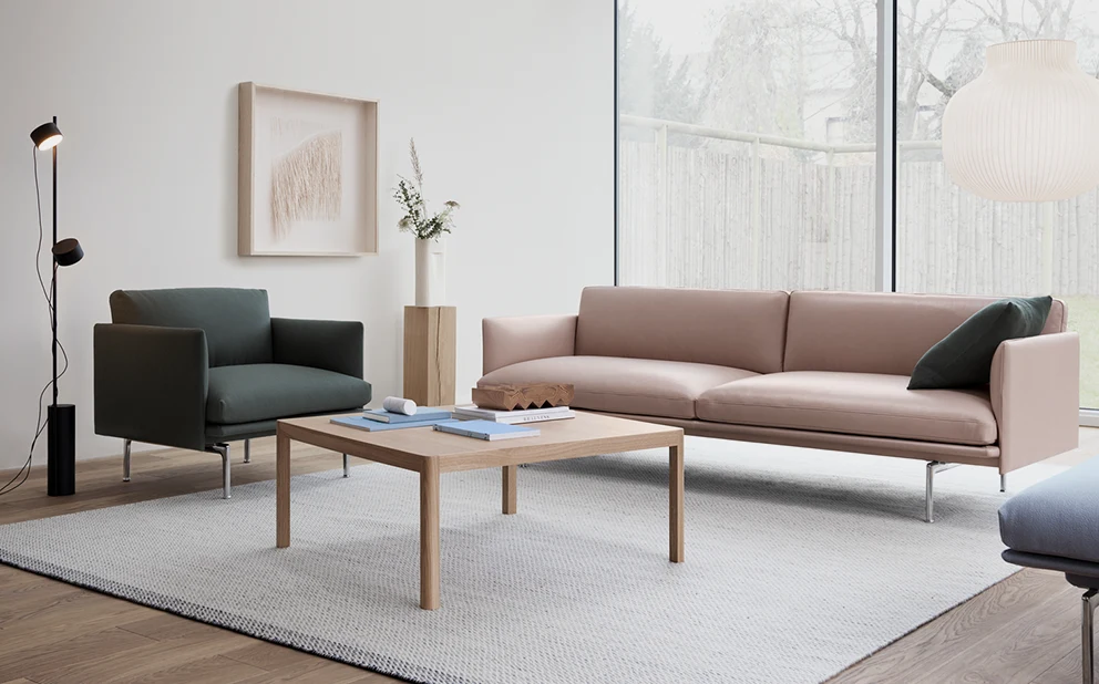 Outline-serien lägger till nya perspektiv på de klassiska skandinaviska designsofforna på 1960-talet och gifter sig med idealen om enkelhet och funktion. Outline-serien är ren och elegant på utsidan med en djup sits och mjuk dämpning på insidan. Outline-serien har ett uttryck som samtidigt är elegant men ändå tidlös, förhöjd med sina linjer som hänvisar till arkitektoniska former tillsammans med sina böjda armstöd, vilket ger designen ett tydligt utseende i olika storlekar och varianter. Avsmalnade linjer och ben i pulverlackerad aluminium. Finns i flera olika tyger och läder samt i 2-sits.