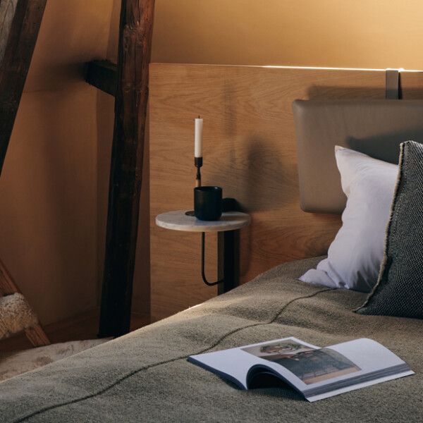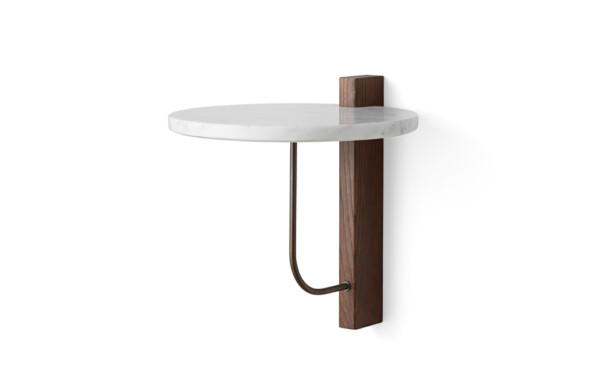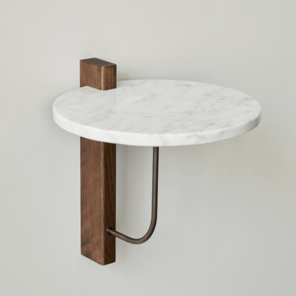 Corbel Shelf, formgiven av trion Krøyer-Sætter-Lassen för Audo Copenhagen, är en minimalistisk vägghylla med vackra, kontrasterande material – mörkbetsad massiv ek, carrara-marmor och pläterad stål. Inspirationen och namnet till detta vägghängda podium kommer från arkitektoniska viktbärande fästen som traditionellt brukar vara tillverkade i sten eller trä. Corbel Shelf passar utmärkt som ett sängbord i sovrummet eller gästrummet.