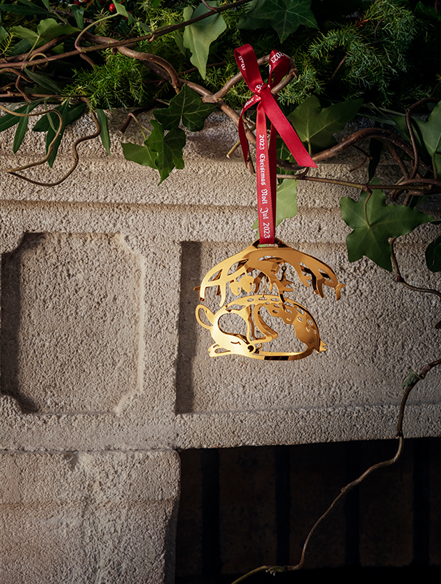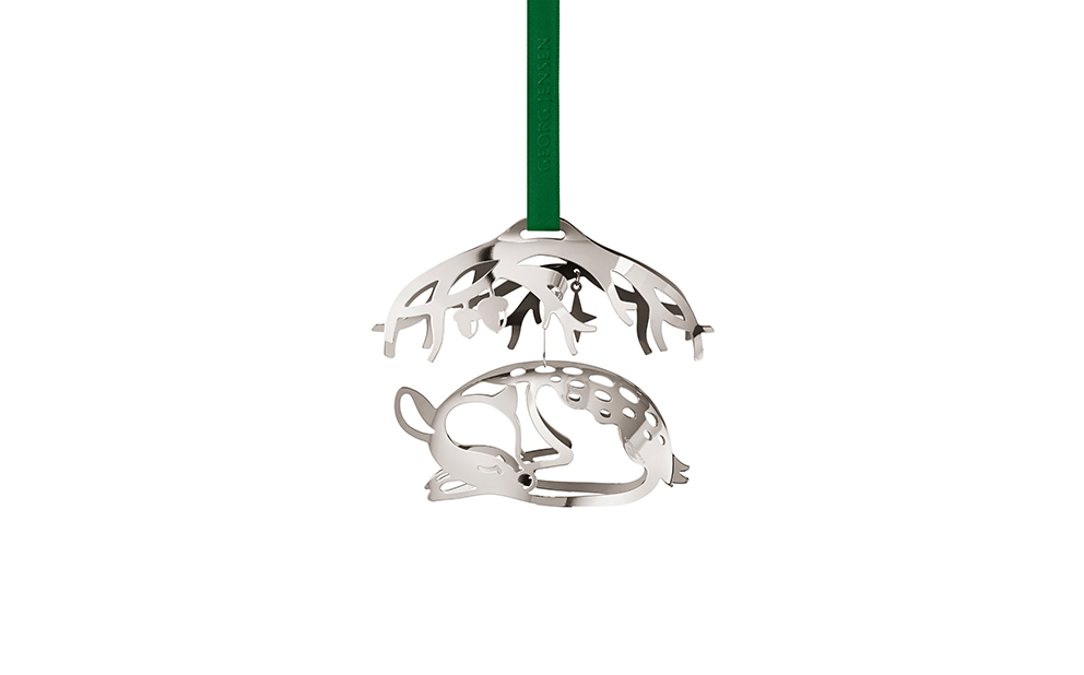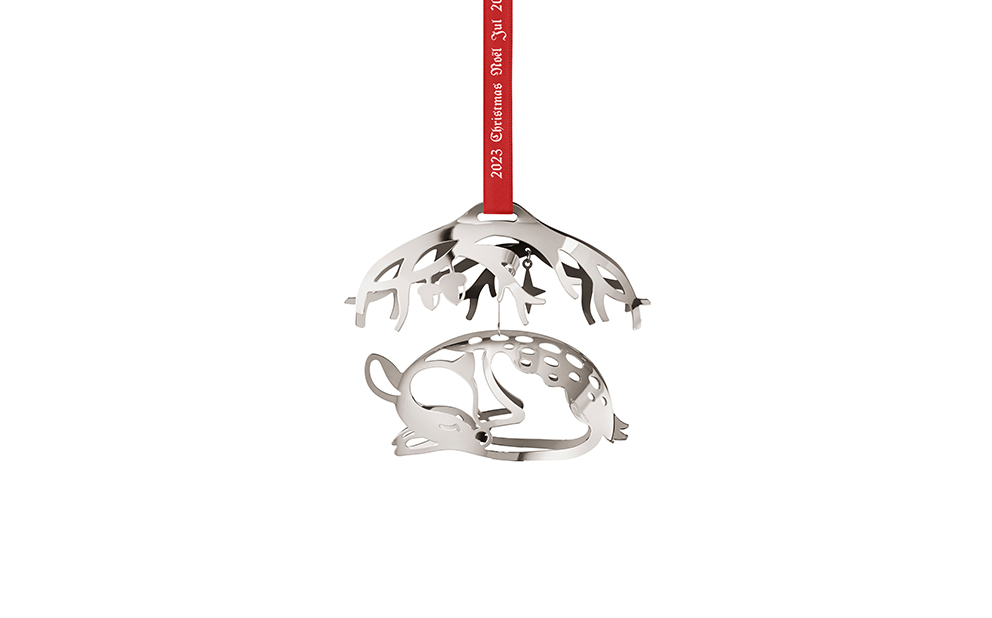 Georg Jensens julmobil för 2023 fångar skönheten av en sovande dovhjort under trädens grenar. Designern Sanne Lund Traberg har återskapat vinterskogens miljö i 2023 års julkollektion och har inspirerats av magin i årstidens vackra landskap. Julmobilen är handgjord i mässing och pläterad med palladium och levereras med två speciella band för upphängning – ett rött och ett grönt. En subtil och elegant tolkning av naturens under i ditt hem.