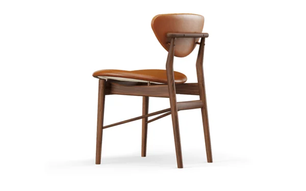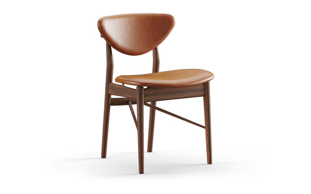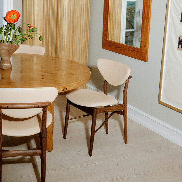 Vid första anblick kan 108-stolen från 1946 uppfattas som enkel i sitt uttryck – men en närmare titt avslöjar dess välarbetade detaljer och vackra hantverk som ger en känsla av dynamik och rörelse. Tack vare sin kombination av form, komfort och hållbarhet återfinns stolen i flera exklusiva restauranger. Den kläs för hand i Danmark i textil eller läder, och stommen finns i ek och valnöt.