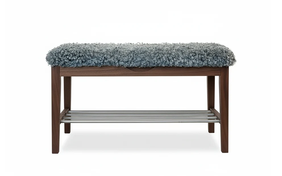 Bänk Lalle i ditt val av trä med skohylla i rostfritt stål. Klädd med gotlandsfårskinn.