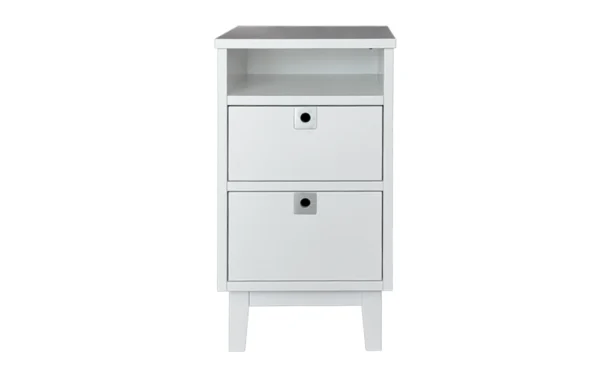 Sängbord Elegant är gjort för moderna lite högre sängar och är 65 cm högt som gör att man lätt kan placera saker som glasögon, vattenglas och telefon på toppskivan. Det har ett öppet fack där man kan lägga favorit boken och små saker. I baksida på facket sitter ett litet hål om man vill lägga som mobiltelefon på laddning i facket. Två rejäla lådor har man till förfogande för alla saker man samlat på sig.