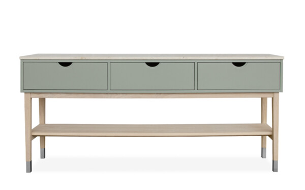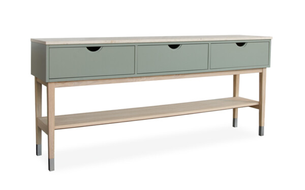 Sideboard från Miljögården Design. Bildexempel på utförande: stomme i vitoljad ek, lådsektion lackerad MDF i färgen oliv, samt toppskiva i kalksten Jura Gelb inklusive skoning i rostfritt.