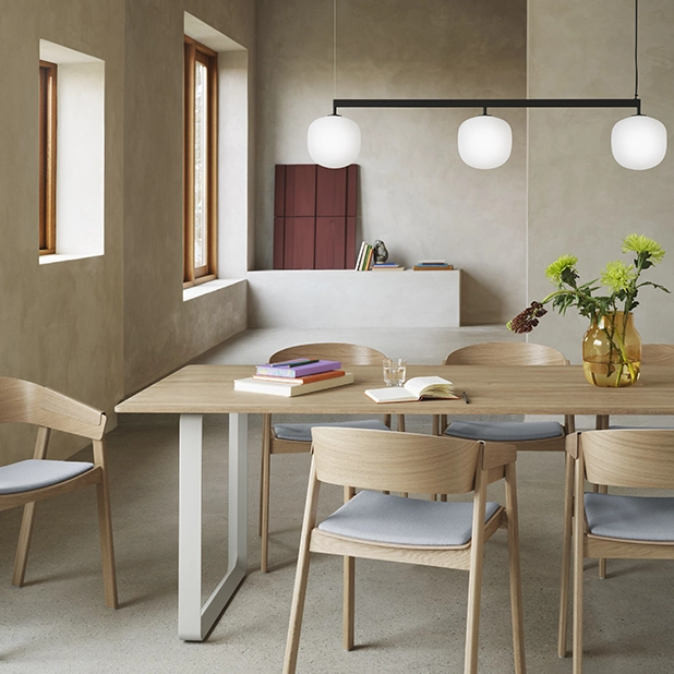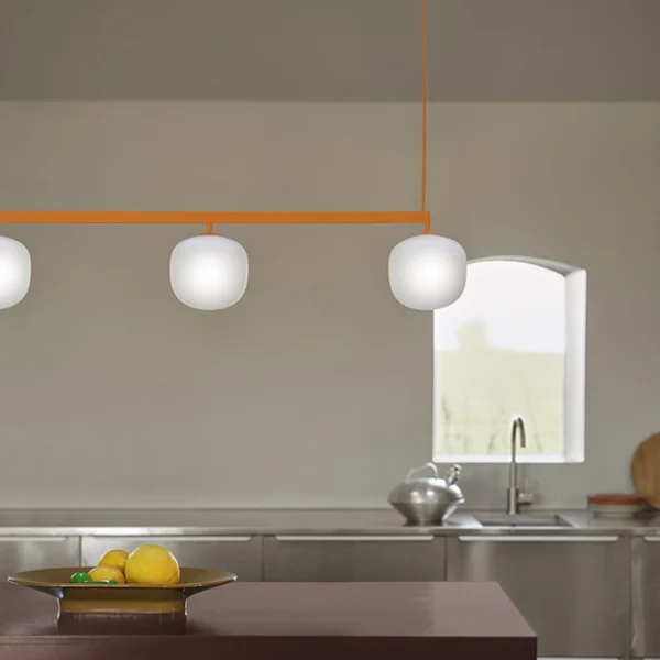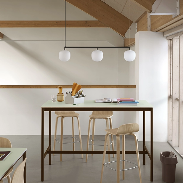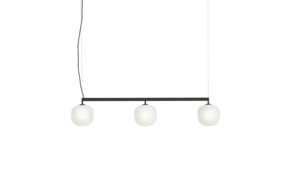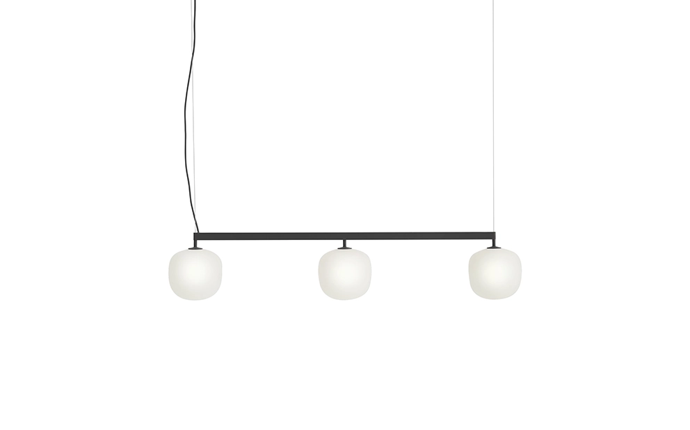 Lamporna i Rime kollektionen är formgivna av TAF Studio för Muuto. Rime Rail är en elegant och modern lampa som passar på många platser i hemmet. Ett rytmiskt samspel av ljus skapas genom att länka samman tre Rime-lampor i en harmonisk helhet. Det mjukt diffusa skenet ger en jämn belysning som balanserar funktion och atmosfär i rummet. Munblåst glas kombineras med en slitstark pulverlackerad skena, vilket tillför både djup och taktil känsla. Resultatet är en elegant men uttrycksfull armatur – perfekt placerad över matbord, köksöar eller konferensbord. Sladd: 400 cm.