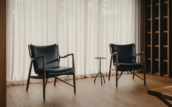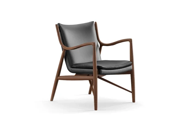 45 Chair, formgiven av Finn Juhl år 1945, markerade en vändpunkt i dansk möbeldesign. Med denna stol introducerade Juhl en banbrytande konstruktion där sits och rygg vilade fritt från ramen – en idé som skulle komma att förändra synen på möbelformgivning för alltid. Den organiska formen, de skulpturala linjerna och det luftiga uttrycket ger stolen en unik lätthet och elegans, ofta beskriven som ”modernismens moderstol”.