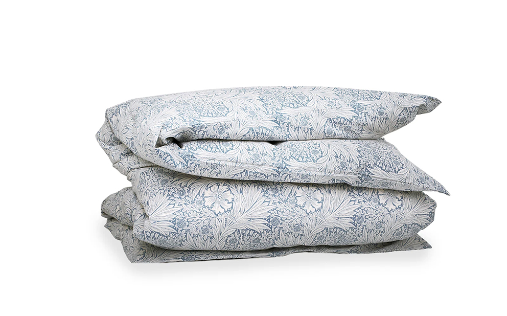 Påslakan i percale i det vackra blommönstret Marigold skapades redan 1875 av den berömda mönsterdesignern William Morris. Påslakanet är i krispig percale som tillverkas av finkammad bomull med en trådtäthet på 300 tc. Det innebär att bomullen kammats så att enbart de långa starka fibrerna finns kvar. Därmed kan man skapa en slitstark väv av finaste kvalitet som behåller sin underbara känsla, tvätt efter tvätt.