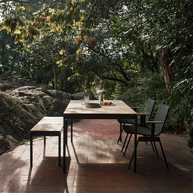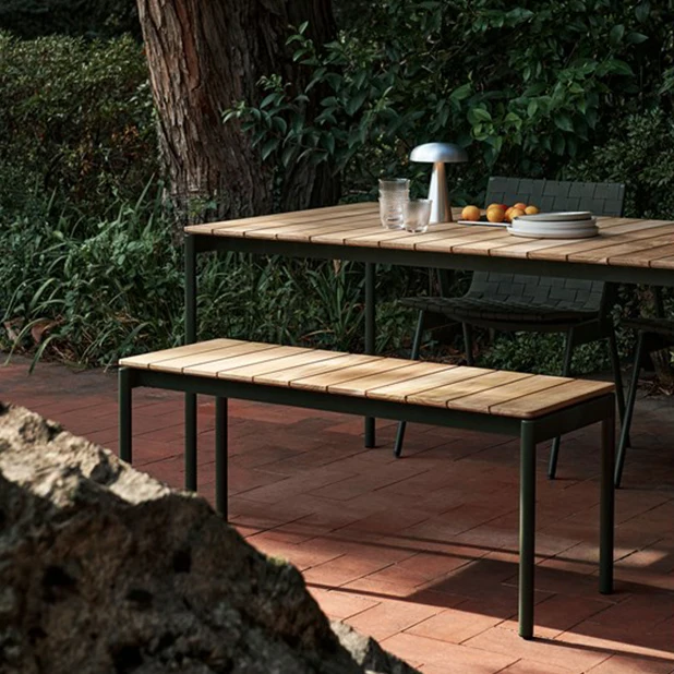 Bänken är tillverkad av ett elegant stålramverk med sits i teak. Designad av Anderssen & Voll som kombinerar funktionalitet med en visuell identitet som präglas av materialvalen. Perfekt för härliga stunder på din uteplats.