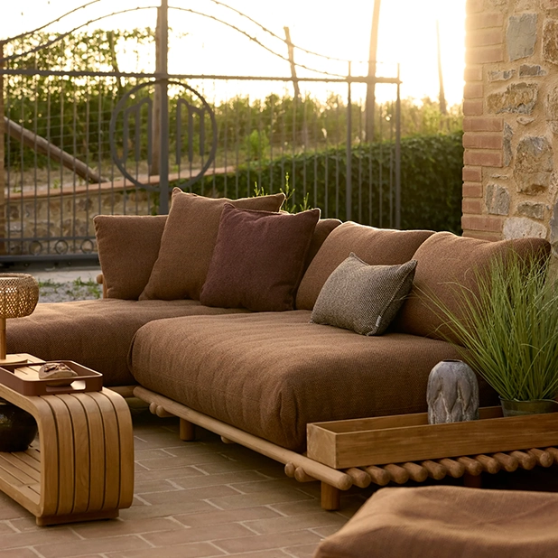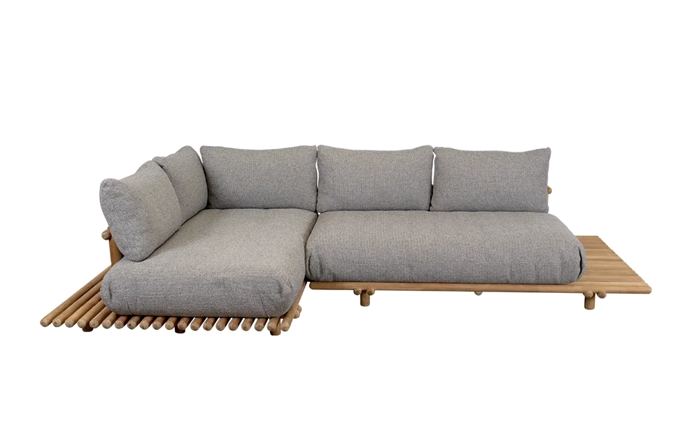 Sticks Platform hörnsoffa, designad av Cane-line Design, kombinerar avslappnad komfort med sofistikerad design, vilket gör den perfekt för både lugn avkoppling och mysiga stunder med nära och kära. Den hållbara ramen finns i certifierad teak, som med tiden utvecklar en vacker silvergrå patina.