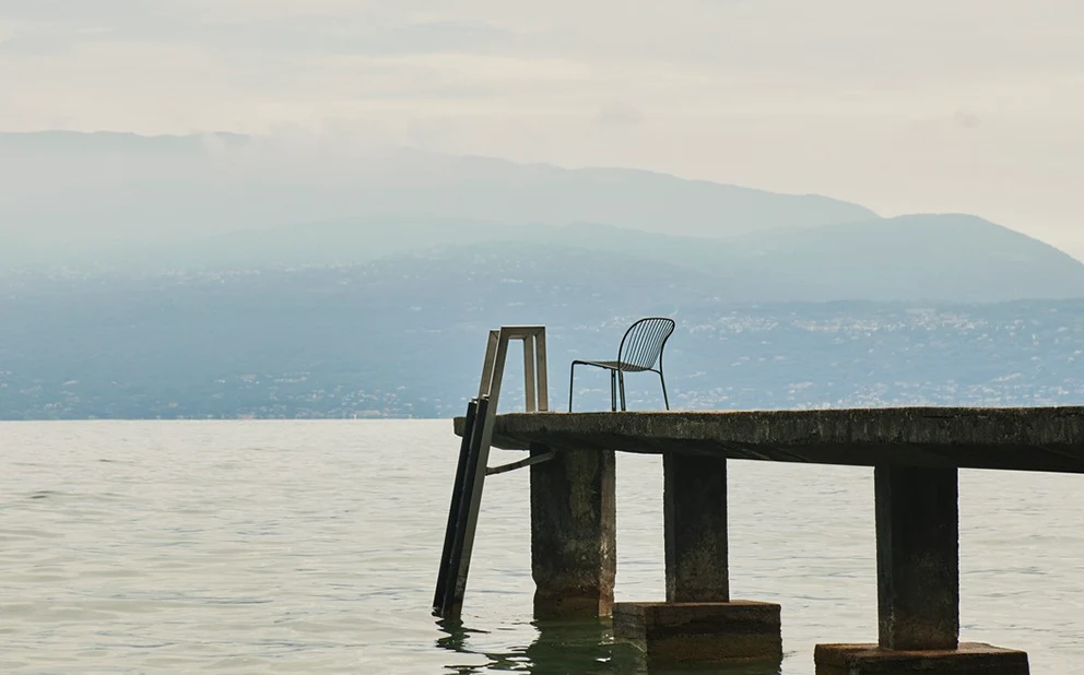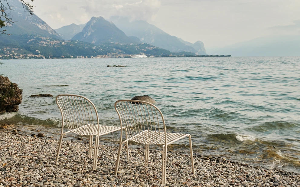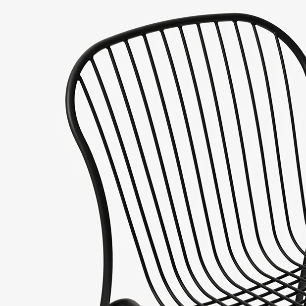 Stålstommen kontrasterar med den lätta rutnätsstrukturen och gör den stapelbara fåtöljen smidig och enkel att placera både utomhus och inomhus, i både naturlig och urban miljö.