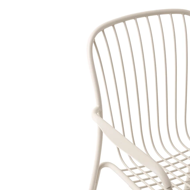 Stålstommen kontrasterar med den lätta rutnätsstrukturen och gör den stapelbara fåtöljen smidig och enkel att placera både utomhus och inomhus, i både naturlig och urban miljö.